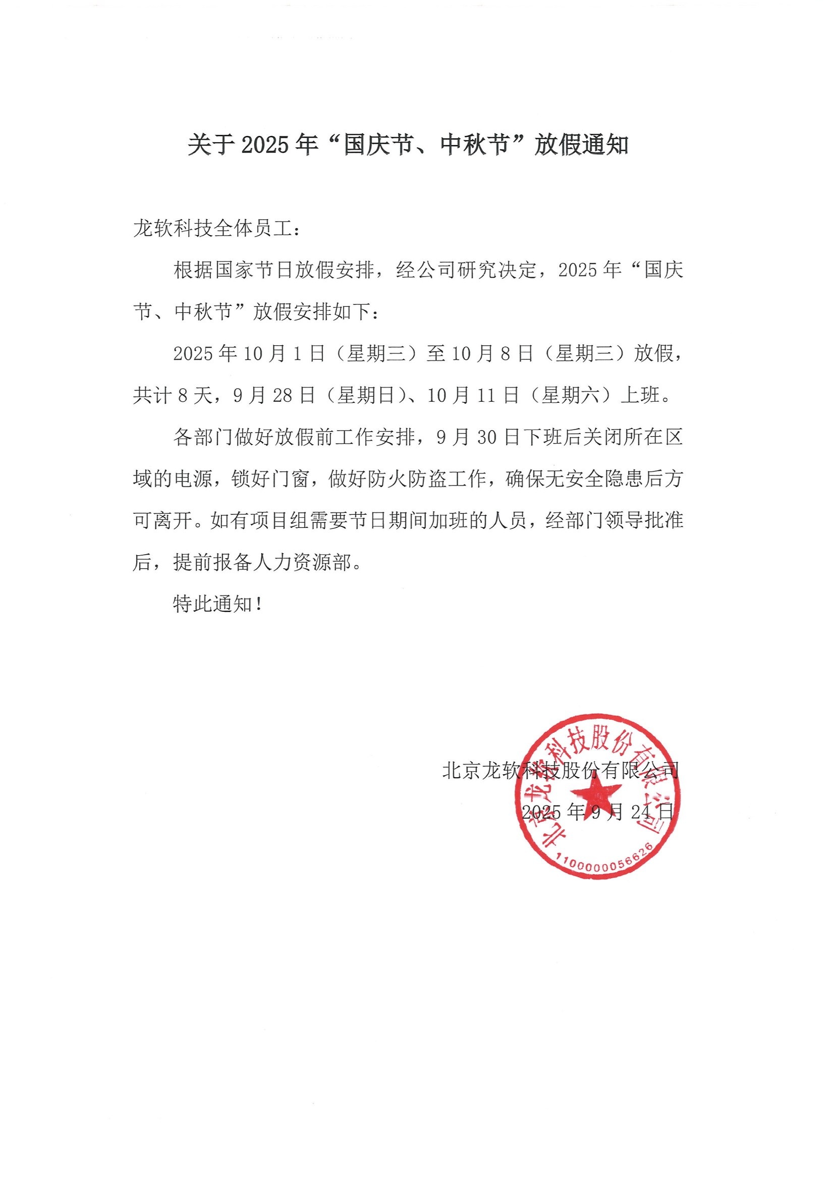 关于2025年“国庆节、中秋节”放假通知